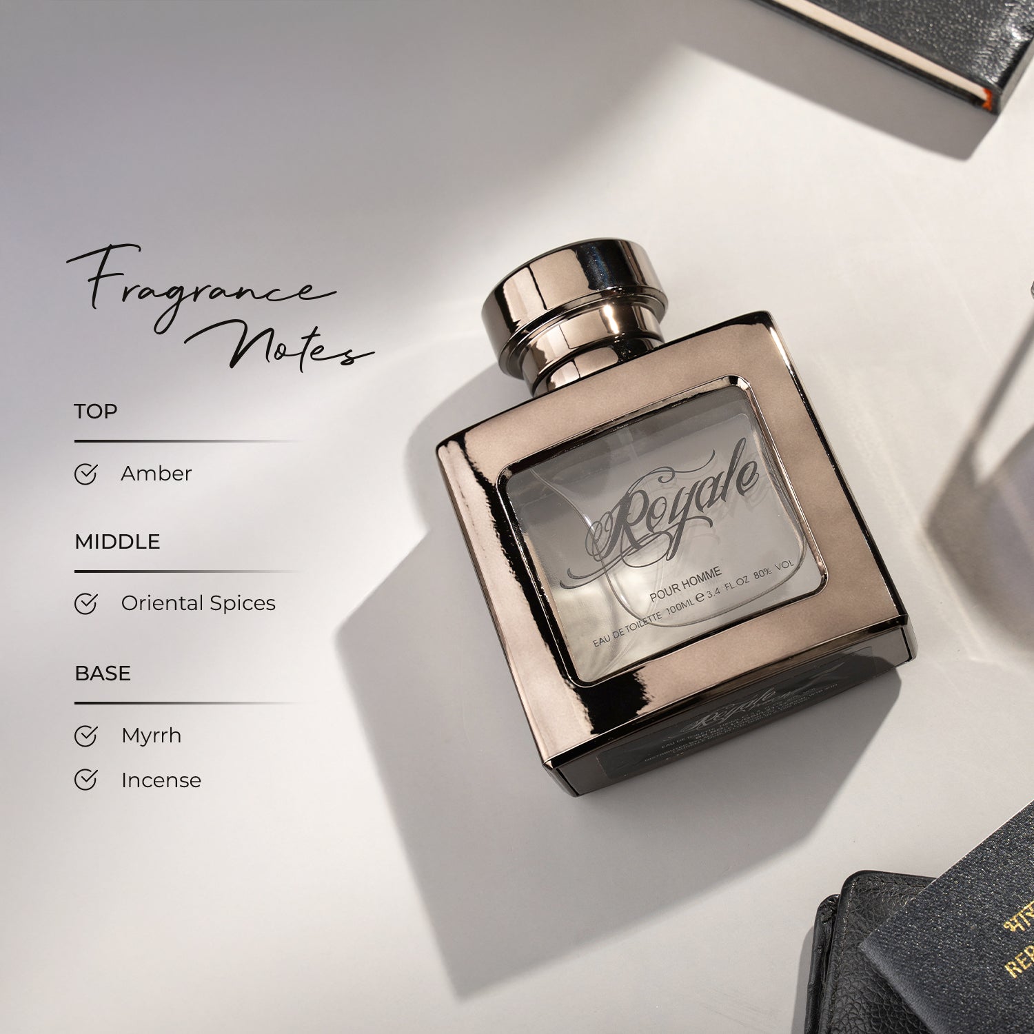 Royale Gun Metal is a woody & spicy oriental fragrance for men. It opens with the intense composition of the amber accord, rounded off by the oriental spices and the warm finish of myrrh & incense. Get ready to experience a bold & captivating fragrance that leaves a lasting impression.