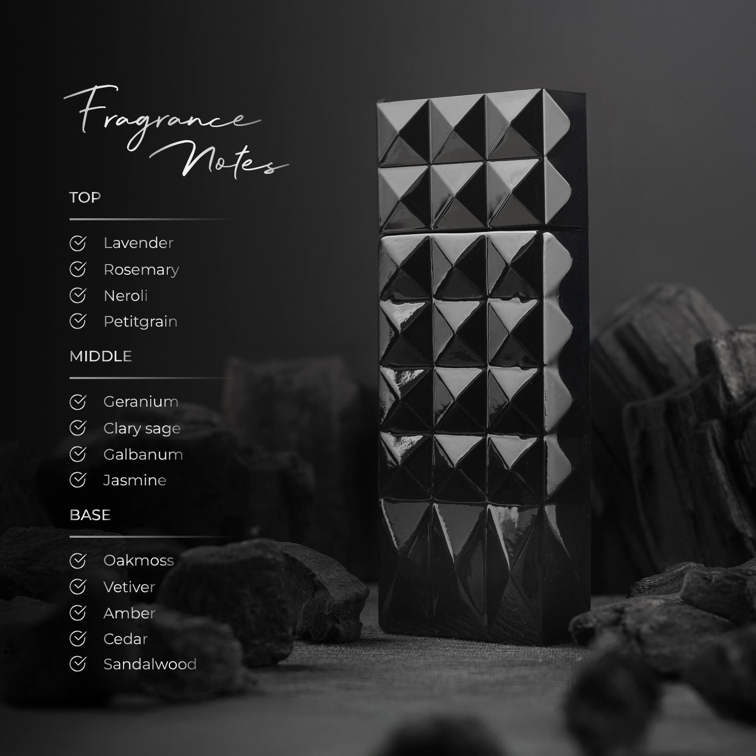 Pure Noir is a refined aromatic woody fragrance. It opens with fresh notes of lavender, rosemary, neroli, and petitgrain. The heart reveals a smooth blend of geranium, clary sage, galbanum, and jasmine. The base brings depth and warmth with oakmoss, vetiver, amber, cedar, and sandalwood, creating a balanced and timeless fragrance for the modern man.