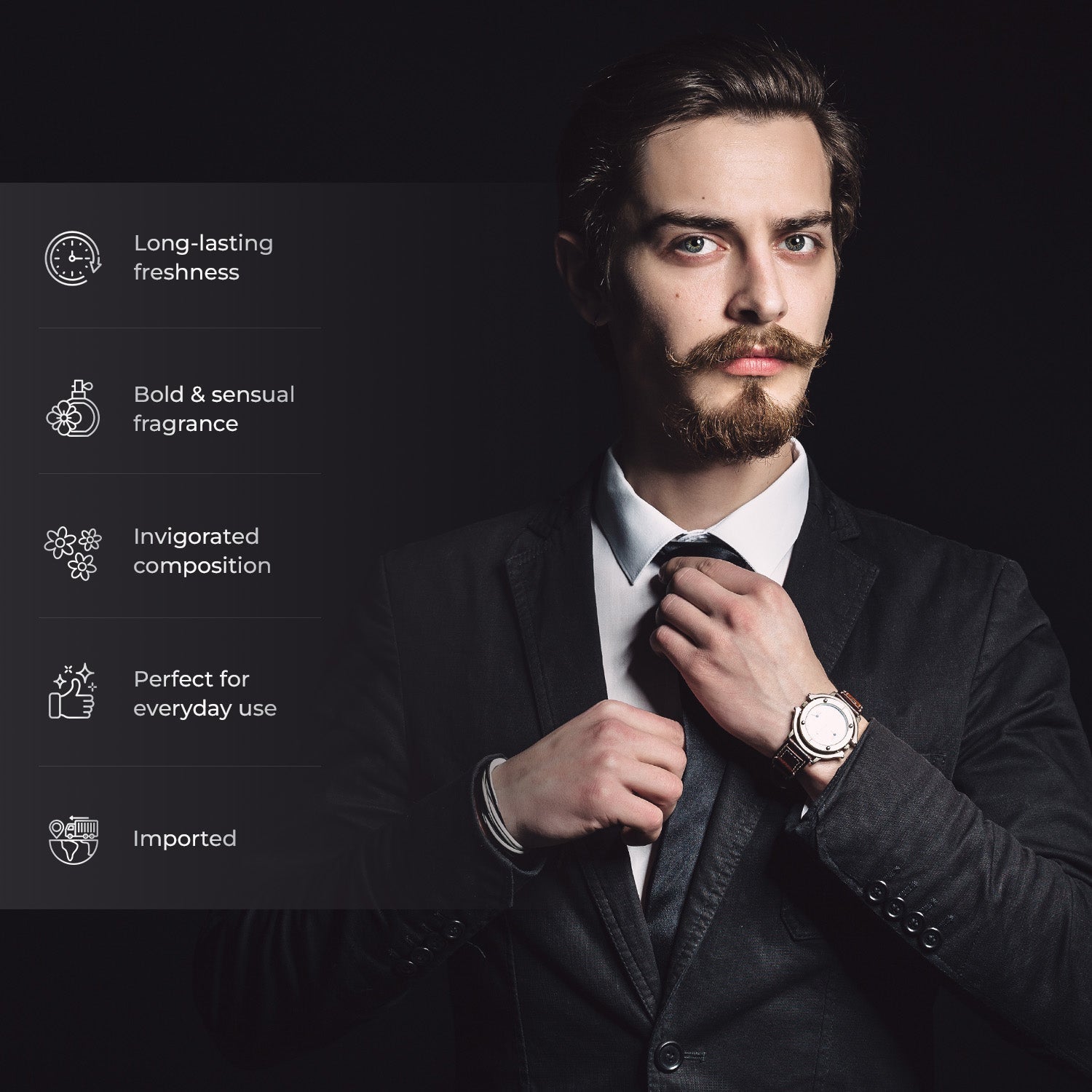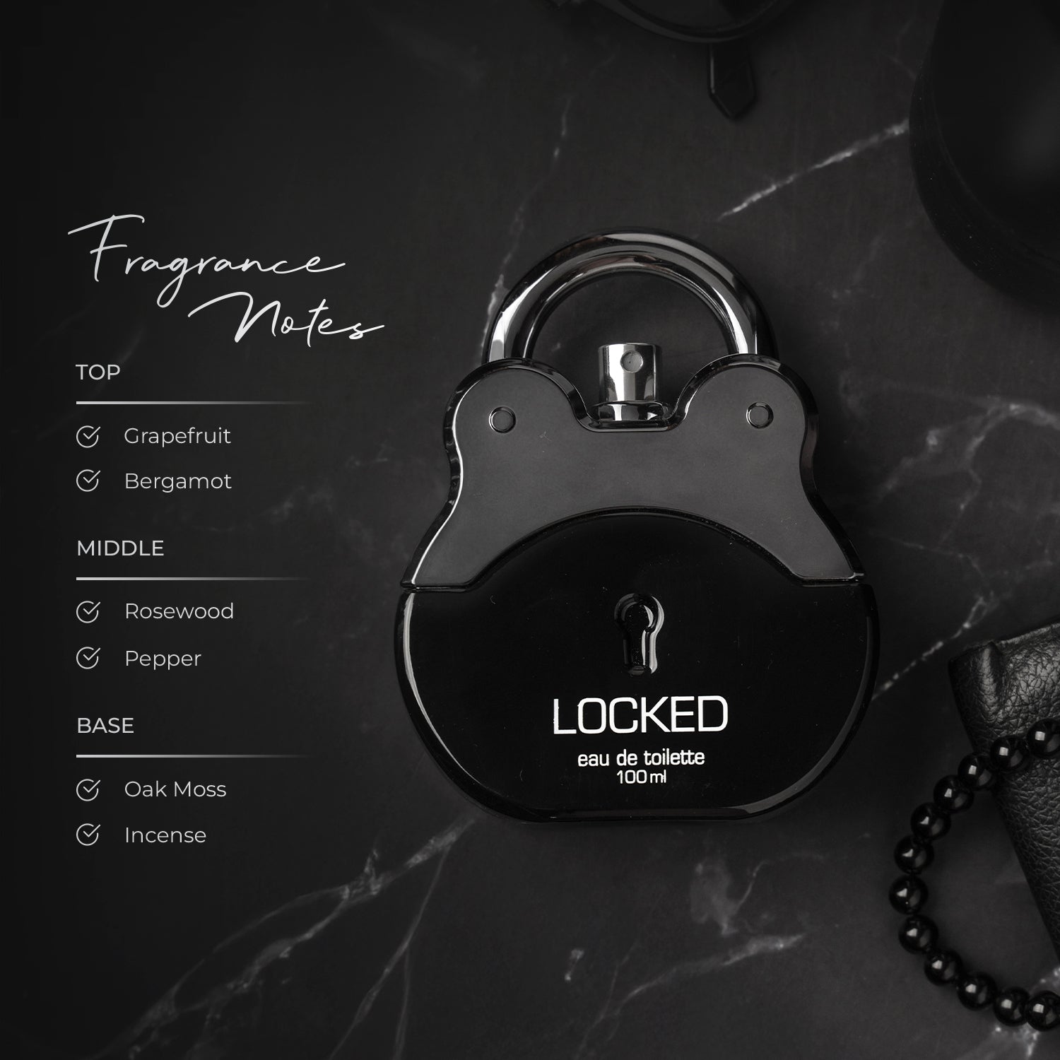 Locked: This is a striking and enticing scent for the modern-day man. This fragrance is the bliss of pure freshness and is perfect for enjoying an uplifting start to the day with its fruity aroma of grapefruit, followed by the warm & woody notes of Oak Moss and incense.
